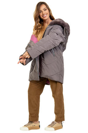 Женское полупальто, прямого силуэта, с воротником-стойкой и съемным капюшоном-шалькой, отороченным искусственным мехом. Основная застежка на молнии. На полочках расположены вертикальные, прорезные карманы на молнии. Рукава с отворотом. Низ изделия оборудован кулисой.